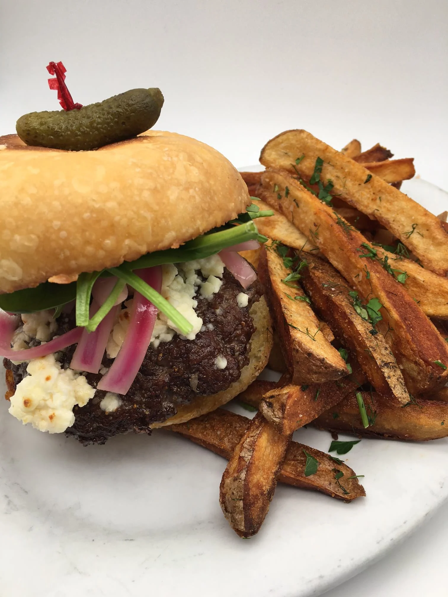 This week’s Burger Special: Grilled All-natural beef burger, melted blue cheese, crispy bacon, tomato confit, petite arugula, Dijon mustard and garlic aioli on house baked toasted Kaiser roll