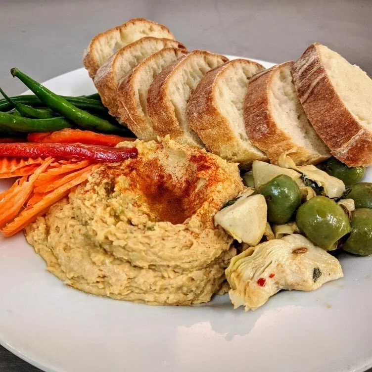 MMM house made hummus, veggies and freshly baked and sliced Big City Bread baguette