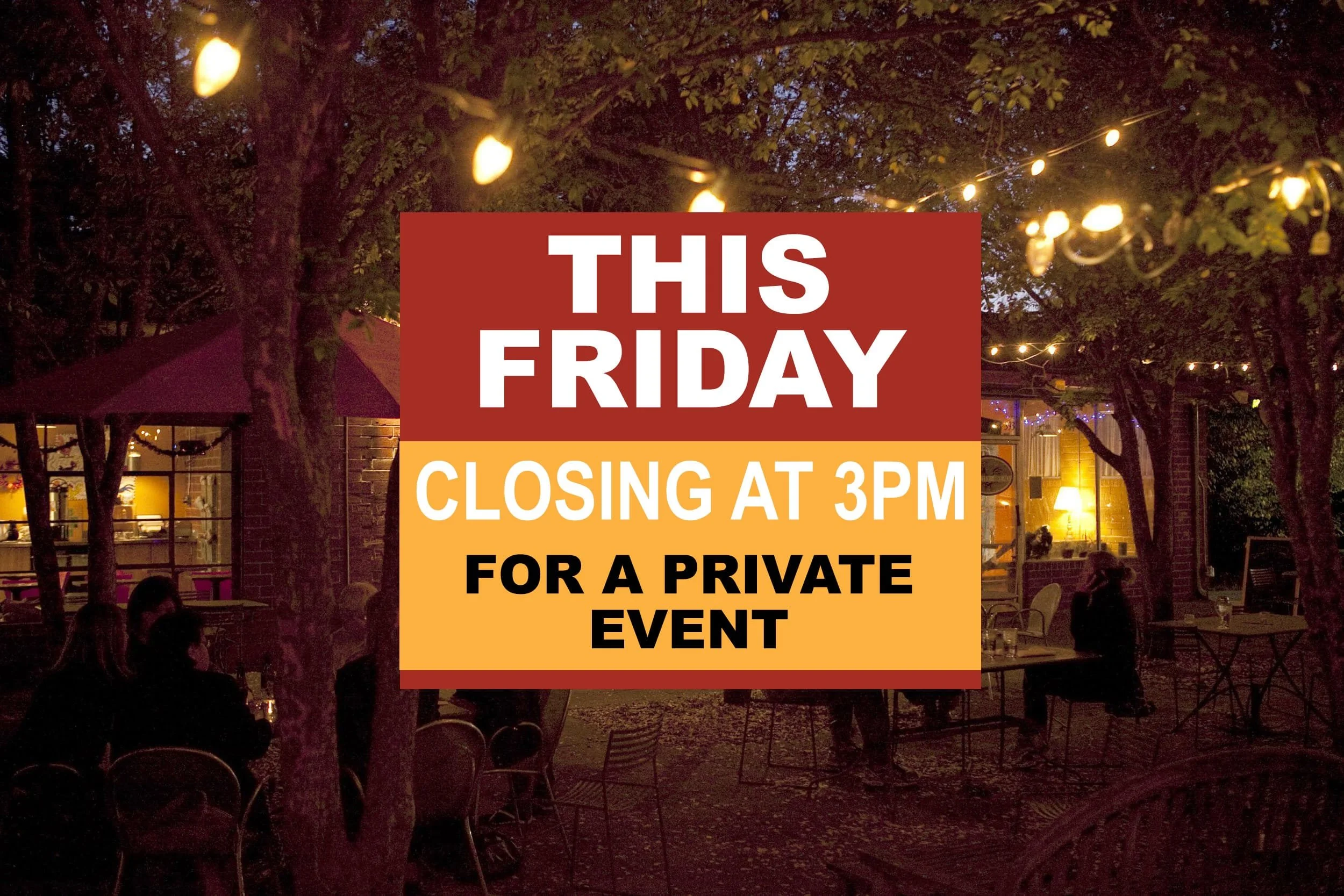 We’ll be closing at 3PM tonight, August 22nd and at 3PM next Friday, August 29th for private events.